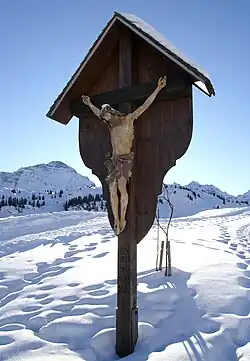 Ikonographische Sonderformen sind das Scheibenkreuz, das Gabelkreuz, das Baumkreuz, der bekleidete Christus am Kreuz (Volto Santo und Sankt Hulpe), das Arma-Christi-Kreuz mit den Leidenswerkzeugen oder das Fünfwundenkreuz mit den Kreuzeswunden Christi. Triumphkreuze sind oft von Maria (Mutter Jesu) und Johannes begleitet, spätmittelalterliche Kreuzigungsgruppen stellen dem Kruzifix meist die beiden Schächer zur Seite. Um 1340 in Deutschland erstmals belegt sind Kreuze, von denen die Christusfigur abgenommen werden konnte, um sie am Karfreitag möglichst realistisch in ein symbolisches Grab legen zu können. Diese Figuren verfügten über schwenkbare Arme mit hölzernen Gelenken. Dieserart bewegliche Christusfiguren der Zeit um 1500 sind heute noch in der Schneidhainer Kirche St. Johannes der Täufer und in der Laurentiuskirche in Neckarweihingen zu sehen.[10]