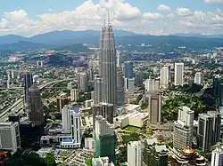 - Die Petronas Towers, die höchsten Zwillingstürme der Welt und gemeinsam das siebthöchste freistehende Gebäude der Welt (insgesamt 452 m; im Vergleich dazu waren die beiden Haupttürme des ursprünglichen World Trade Centers bis zum Dach 417 m und 415 m hoch, mit Antenne jedoch 527 m), mit einem der größten Einkaufszentren (Mall) Malaysias, das Suria KLCC. Der umgebende Stadtteil „Goldenes Dreieck“ (The Golden Triangle) bildet den kommerziellen Mittelpunkt der Stadt und bietet darüber hinaus ein reges Nachtleben.