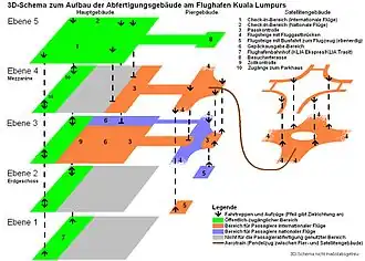 Das Bauwerk besteht aus fünf übereinanderliegenden Ebenen. Die unterste Ebene beherbergt den Flughafenbahnhof, von dem die KLIA-Ekspres-Züge alle 15 bis 20 Minuten ohne bzw. die KLIA Transit-Züge alle 30 Minuten mit Zwischenhalten bis zum Hauptbahnhof Kuala Lumpurs fahren.[8] In der zweiten Ebene befinden sind die Zugänge zum Pan Pacific Hotel und dem Parkhaus, welches sich zwischen dem Hauptabfertigungsgebäude und dem Tower befindet. In der dritten Ebene werden alle ankommenden Passagiere abgefertigt, so dass sich hier unter anderem Gepäckausgabebänder, Passkontrolle, Zollkontrolle, Geldwechsler sowie Hotel- und Tourorganisationen befinden. In der vierten Ebene ist hauptsächlich die Gepäckförderanlage untergebracht. In der obersten, der fünften Etage, sind die Einrichtungen für die abfliegenden Passagiere angesiedelt.