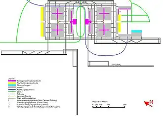 - Hauptgebäude, Ebene 5: Straßenzufahrt, Check-in (1), Ebene 4: Passkontrolle (3), ca. 100 m zum Piergebäude