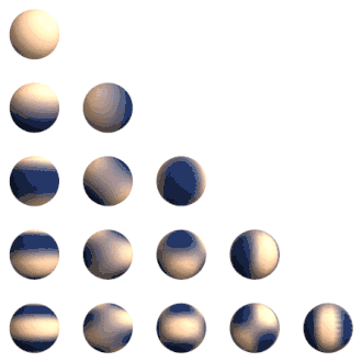 Wenn m gleich Null ist (oben links), sind die Schwingungsfunktionen nicht von der geographischen Länge abhängig und werden als zonal bezeichnet. Wenn ℓ = |m| (unten rechts), gibt es keine Nulldurchgänge in der geografischen Breite, und die Funktionen werden als sektoriell bezeichnet. In den anderen Fällen decken die Funktionen die Kugel ab und werden als tesseral bezeichnet.