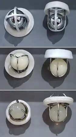 Eines der bekanntesten Beispiele für ein Kugelventil ist die, dem 1952 erstmals von Charles A. Hufnagel erfolgreich implantierten Plexiglaskugelventil[1] ähnliche, Starr-Edwards-Herzklappenprothese, deren Produktion jedoch 2003 eingestellt wurde. Die Kugel wird bei dieser Prothesenart durch einen Drahtkäfig über der Ventilöffnung gehalten. Durch konstruktions- und fertigungstechnische Fortschritte konnte jedoch die mechanische Zuverlässigkeit von Doppelflügelklappen die der Starr-Edwards-Prothesen erreichen, bei gleichzeitig größerem Durchfluss und geringerer Hämolyse.