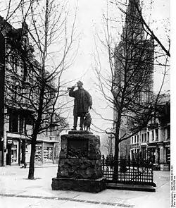 Das erste Kuhhirtendenkmal mit einer Reliefplatte entstand nach den Entwürfen von August Schmiemann aus Münster, welcher oben erwähnten Kiepenkerl geschaffen hatte. Der Kuhhirte fand seinen Platz auf dem Marktplatz, unweit der Propsteikirche. Die Enthüllung erfolgte am 29. Mai 1908.[12] Die Statue stellt einen Kuhhirten mit seinem Hirtenhund dar. Die Größe der Figur ohne Sockel war 2,20 Meter. Das Material war Bronze und sehr genau im Detail modelliert.[13] Die Reliefplatte war ebenfalls Bronze. Man konnte einen Hirten vor der Altstadtkulisse sehen, der seine Herde durch die Stadt treibt.[14] Während des Zweiten Weltkriegs im Jahr 1944 wurde die Statue des Grafen Engelbert zu Kriegszwecken demontiert.[15][16] Da das Kuhhirtendenkmal zusammen mit dem Engelbert und dem Soldatendenkmal aus Gerthe auf dem Schrottplatz fotografiert wurden, dürfte sie das Schicksal zeitgleich ereilt haben.[17] Die Denkmäler wurden wahrscheinlich eingeschmolzen.