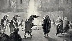 Wolfstanz mit Wolfsmasken (Walas'axa) bei einem Potlach der Kwakiutl. Buchillustration von Wilhelm Kuhnert in: Franz Boas: The Social Organization and the Secret Societies of the Kwakiutl Indians (1897), Tafel 36
