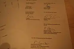 Gestützt auf die Vorschläge eines vermittelnden Gremiums der Bundesbehörden[1] haben die zuständigen politischen Behörden beider Kantone und der Stadt Zürich sowie die Stiftsbibliothek St. Gallen und die Stiftung Zentralbibliothek Zürich am 6. März 2006 eine grundsätzliche Einigung getroffen. Diese wurde von den zuständigen politischen Organen und Behörden am 27. April 2006 unterzeichnet.