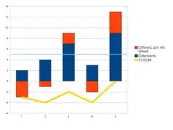 In der statistischen Prozess- und Qualitätskontrolle ist die kumulative Summe oder CUSUM (von englisch cumulative sum) eine sequentielle Analysemethode zur Entdeckung von Änderungen in einer sequentiellen Datenreihe oder Zeitreihe (z. B. Kurswechsel bzw. Wendepunkte).[1] E. S. Page definierte 1954 eine Qualitätszahl , einen Parameter einer Wahrscheinlichkeitsverteilung; z. B. den Erwartungswert. Er entwickelte CUSUM als Methode, um generelle Änderungen des Parameters aus zufälligem Rauschen herauszufiltern, und schlug ein Grenzkriterium vor, ab dem in den Prozess eingegriffen werden sollte. Einige Jahre später stellte George Alfred Barnard das V-Mask Diagramm vor zur visuellen Entdeckung von Änderungen von .[2]