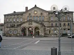 Den historischen Bahnhof entwarf Eduard Rüber. Das Empfangsgebäude (Bahnhofplatz 9) wurde 1863/1864 über einem querrechteckigen Grundriss mit breitem Mittelrisalit errichtet. Die Längsseiten weisen neun, die Querseiten drei Achsen auf, dabei bestehen die Achsen an den Längsseiten zum Teil aus gekuppelten Doppelfenstern. Auf den Bahnsteigen sind zum Teil noch die ursprünglichen Überdachungen auf den gusseisernen Ständern erhalten.
