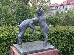 Steinbock und Ziege | Bronze, unbekanntes Datum | unbekannter Künstler | Am Kinderdorf 23/37, im Vorgarten der Grundschule am Windmühlenberg (Gatow) | 52° 29′ 8,7″ N, 13° 10′ 27,8″ O |