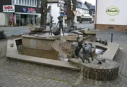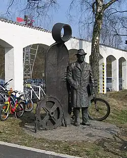 Die Bronzestatue vor dem DampfLandLeute-Museum Eslohe stellt den Fabrikanten Eberhard Koenig dar, der eine umfangreiche Sammlung von Dampfmaschinen und Motoren aufbaute.[1] | |||