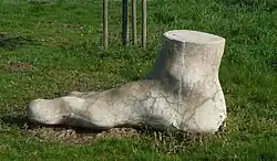 Das Original dieses monumentalen Fußes an der Fußgönheimer Straße in Ruchheim ist aus Schaumstoff und steht in Rom im Eingangsbereich eines Raumausstatters. Es wurde entworfen von Le Corbusier. Der Repräsentant dieser Firma in Deutschland ließ davon eine Form gestalten und sie mit Beton ausgießen. | |