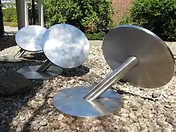 Schräglage | Edelstahlplastik auf Kieselsteinen, Wasser-/Windobjekt, 1980[8] | Hein Sinken | Stadtrandstraße 555 (Falkenhagener Feld) | 52° 33′ 45″ N, 13° 9′ 29″ O |