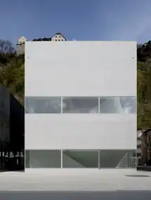 Der geschlossene Baukörper ist eine Black Box aus schwarz eingefärbtem Zement und schwarzem Basaltstein. Eingeschlossene Flusskiesel der Aussenhaut des Gebäudes stellen zugleich den Bezug zur Landschaft des Rheintals her. Lang gezogene Fensterbänder ordnen sich der Kompaktheit des Baukörpers unter und öffnen den schwarzen Kubus sowohl von innen als auch von aussen. Sechs Ausstellungssäle sind um zwei gegenläufige Treppen herum angeordnet. Die Grundrisseinteilung, Windmühlenflügeln gleich, erlaubt diagonale Durchblicke durch den gesamten Baukörper.