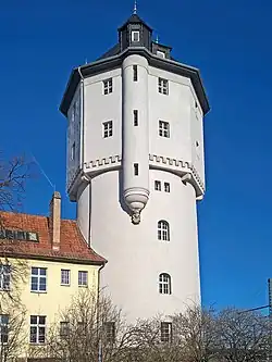 Der stadtbildprägende Turm hat eine Höhe von 35 Metern und wird mittlerweile als Sozialgebäude mit vier Etagen genutzt. Im Anbau des Turmes werden Ferienwohnungen vermietet.