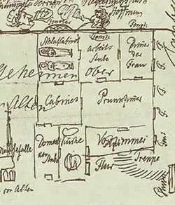 Hoffmann zog am 1. Juli 1815 mit seiner Ehefrau Michalina in eine Wohnung im Haus Taubenstraße 31.[3] Das Haus gehörte zu einem Block zwischen der Charlottenstraße, der Taubenstraße, der Friedrichstraße und der Jägerstraße; die straßenseitigen Fenster der Wohnung lagen teils zur Charlottenstraße, teils zur Taubenstraße hin. Das Haus gehörte dem Geheimen Oberbaurat von Alten. In einer Nachbarwohnung hauste der mit Hoffmann befreundete Schauspieler Devrient.[4] Das Gebäude wurde 1905 abgerissen und 1907 durch einen Nachfolgerbau ersetzt. Dort erinnert eine Gedenktafel an Hoffmann, dessen letzter Wohnsitz die Wohnung in der Taubenstraße war.[5] Der Kunzsche Riss gibt keine Auskunft darüber, wie das Wohnhaus von außen aussah, doch bei Günter de Bruyn ist zu lesen: „Es war ein dreigeschossiges Haus mit Walmdach, quaderartigem Putz und Kränzen von Stuck an der wohlproportionierten Fassade [...] Hoffmanns wohnten oben im zweiten Stock, der, wie das Erdgeschoß auch, niedriger war als die prächtige, hochfenstrige Mitteletage.“[6]