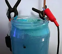 Alternativ kann Kupferhydroxid auch durch die elektrochemische Umsetzung von Kupfer in Wasser hergestellt werden.