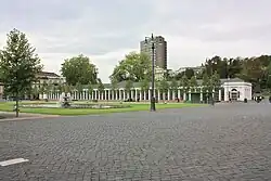 Die drei Gebäude umschließen seitdem den zentralen Platz des Kurviertels von Wiesbaden auf drei Seiten. Um das Bowling Green, einen rechteckigen Platz mit zwei Kaskadenbrunnen, gruppieren sich an seinen Längsseiten sehr ähnliche Kolonnaden und quer dazu das 1905 bis 1907 erbaute neue Kurhaus. Der Vorläuferbau, das erste Kurhaus nach dem Entwurf von Christian Zais, bildete zusammen mit den Kolonnaden, den parallel laufenden Platanenalleen und den beiden Bassins ein klassizistisches Ensemble, zu dem auch der jenseits der Wilhelmstraße liegende damalige Theaterplatz (heute: Kaiser-Friedrich-Platz) gehörte.