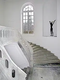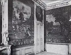 Das Gebäudeinnere wirkt räumlich sehr elegant. Es ist quer erschlossen. Eine seitliche Treppe geht vom rokokodekorierten Vestibül zunächst einläufig aus, um sich nach oben hin mit ausgerundeter Rückwand hufeisenförmig fortzusetzen. Im Inneren finden sich großzügige Gemächer und Salons, die besonders im Obergeschoss des Hauptteils durch ihre Raumhöhe bestechen. Der dort gelegene große Festsaal, der sich zum Gartenhof mit einem Balkon öffnet, nimmt die gleiche Fläche ein wie drei unter ihm im Erdgeschoss befindliche Säle. Viele Räume waren reich geschmückt und zum Teil mit vergoldetem Stuck, Gobelins, Lüstern und Kaminen ausgestattet. Die Räume der Ostseite werden durch eine Folge von Verbindungstüren erschlossen. Hierbei handelt es sich um das älteste Beispiel Dresdens für diese aus Frankreich bekannte Raumstruktur, die als Enfilade bezeichnet wird.[5]