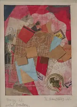 Mit Merz bezeichnete Schwitters seine Technik, aus Zeitungsausschnitten, Reklame und Abfall Collagen zu erstellen. Als Gegenprojekt zu dem eher destruktiven Dadaismus sollten diese seit 1919 entstandenen Bilder und Skulpturen für einen Wiederaufbau stehen, was Schwitters in die Nähe des Konstruktivismus rückt. Der Begriff „Merz“ entstand bei einer Collage aus einer Anzeige der „Kommerz und Privatbank“[10] und evoziert Assoziationen zu „Kommerz“, „ausmerzen“, „Scherz“, „Nerz“, „Herz“ und dem Monat März, der für den Frühlingsanfang steht.