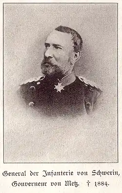 Ausgezeichnet mit beiden Klassen des Eisernen Kreuzes sowie des Ordens pour le Mérite wurde Schwerin nach dem Friedensschluss am 18. August 1871 zum Generalleutnant befördert und zum Kommandeur der 6. Division ernannt, die Teil der Okkupationsarmee in Frankreich war. Sein Hauptquartier befand sich zunächst in Reims, später in Bar-le-Duc. Anfang August 1873 führte Schwerin seine Division in die Garnison nach Brandenburg an der Havel zurück. Mit seiner Ernennung zum Gouverneur von Metz gab er am 19. November 1876 die Division an seinen Nachfolger von Manteuffel ab. Im Mai des Folgejahres erhielt Schwerin den Stern der Komture des Königlichen Hausordens von Hohenzollern und wurde im September 1879 in Anerkennung seiner Dienst auch zum Domherr von Brandenburg ernannt. Er avancierte am 18. September 1880 zum General der Infanterie und wurde im Januar 1882 anlässlich des Ordensfestes mit dem Großkreuz des Roten Adlerordens mit Eichenlaub und Schwertern am Ringe ausgezeichnet. Schwerin verstarb am 13. April 1884 in Ausübung seines Dienstes in Metz an einem Gehirnschlag.