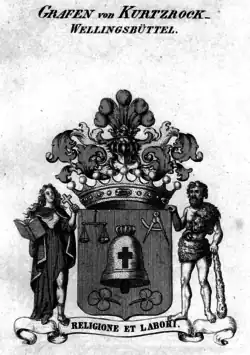 Die Herren, später Freiherren und Grafen von Kurtzrock waren ursprünglich eine katholische thüringische Familie, die Kaiser Rudolf II. 1587 als adlig bestätigte.[1] Heinrich und Theobald von Kurtzrock erhielten am 14. April 1654 von Kaiser Ferdinand eine Wappenvermehrung. Theobald von Kurtzrock war zunächst fürstbischöflicher hildesheimischer Amtmann in Ruthe und ab 1676 kaiserlicher Gesandter in Bremen; als solcher übte er bald von Münster über Ostfriesland bis Hamburg erheblichen Einfluss aus.[2] Er heiratete die Tochter des Hamburger Reichspostmeisters Johann Baptista Vrints von Treuenfeld und erwarb 1673 das Gut Wellingsbüttel, für das er und seine Nachkommen Reichsunmittelbarkeit beanspruchten. Mit Diplom vom 3. April 1678 erhielt er den rittermäßigen Reichsadel mit dem Titel Edler von Wellingsbüttel. Seine Söhne Max Heinrich und Franz wurden wie sein mit seiner Schwester verheirateter Schwager, der Postmeister Heinrich Bagen von Ehrenfeld, vom Fürstbischof von Hildesheim mit dem einst von der Postmeisterfamilie Hinüber errichteten Posthof vor den Toren der Stadt Hildesheim belehnt.[3]