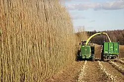 Kurzumtriebsplantagen sind Dauerkulturen, die üblicherweise bis zu 20 Jahre mit durchschnittlich 3 bis 6 Ernterotationen genutzt werden können.[1] Die Ernte erfolgt im mehrjährigen Umtrieb, der Bestand hat zur Erntezeit eine Höhe von 6 bis 8 Metern erreicht. Die Erträge bei Balsampappeln liegen dabei zwischen 10 und 15 Tonnen pro Hektar und Jahr, bei Weiden bei 5 bis 10 Tonnen pro Hektar und Jahr. Der Erntezeitpunkt liegt optimal im Winter nach dem Blattabfall, da hierdurch ein großer Teil der Nährstoffe auf den Feldern verbleiben kann.[2] Als Erntemaschinen werden bei kurzen Umtriebszeiten meist hochmotorisierte, selbstfahrende Feldhäcksler mit Schwachholzeinzug verwendet, daneben auch Anbaumähhacker. Holzvollernter (Harvester) und Bündler aus der Forsttechnik können auch bei ertragreicheren Kulturen sowie bei längeren Umtriebszeiten eingesetzt werden. Wichtig ist es, den Boden nicht zu stark zu verdichten, damit die Bäume in einem gut durchlüfteten Boden stehen können.