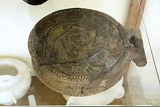 Die Griffschale ist aus mehreren Bruchstücken zusammengesetzt, Fehlstellen am Griff, an der Wandung und an der Bodenplatte sind mit Gips ergänzt. Die Höhe der aus dunkelgraubraunem bis rotbraunem Ton gefertigten Griffschale beträgt 6,15 cm, die Länge 23,8 cm. Der Randdurchmesser ist mit 20,45 cm geringfügig kleiner als der Bodendurchmesser mit 21,2 cm. Die äußere Oberfläche und die Beckeninnenwandung sind mit einem dunkelgraubraunen bis olivbraunen Überzug versehen. Der Beckenboden ist unregelmäßig ausgestrichen, er zeigt geringe Spuren von Versinterung.[1] Die Bodenplatte ist mit mehreren geritzten unregelmäßigen Kreisen, eingedrückten Dreiecksbändern und zwei doppellinigen langgezogenen Spiralbändern verziert. An der Wandung ist ein doppelliniges langgezogenes Spiralband durch jeweils eine Dreiecksreihe an der Ober- und Unterkante umgeben.[2] In den Verzierungen sind weiße Farbreste.