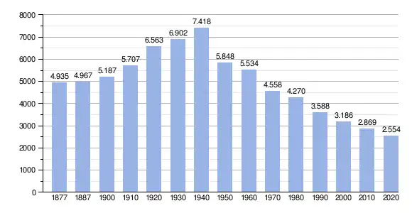 Nach einem Anwachsen der Gemeindegröße auf über 6500 Einwohner um 1940 sank die Zahl der Bevölkerung stetig bis unter 3000.