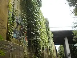 Neben innerörtlicher Veloroute und Spazierweg in eng gebauter Stadt am Flussufer. Abhilfe: Begrünung mit Kletterpflanzen