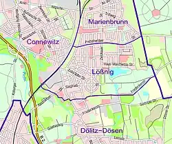 Die Nachbarortsteile von Lößnig sind Marienbrunn, Probstheida, Dölitz-Dösen und Connewitz.