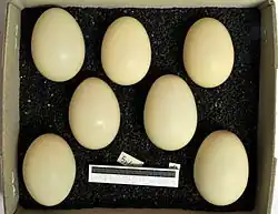 Das Gelege umfasst in der Regel acht bis zwölf Eier. Geht das Gelege verloren oder wird das Weibchen während der Brutzeit so gestört, dass sie das Gelege aufgibt, sind Nachgelege selten. Die Eier sind von graugrüner Farbe, sind etwa fünf Zentimeter lang und wiegen zwischen 35 und 43 Gramm. Das Gelege wird nur durch das Weibchen bebrütet. Dieses verlässt zu Beginn der Brut das Gelege jeweils einmal morgens und nachmittags. Die Brutpause kann anfangs bis zu zwei Stunden dauern. Sie verkürzen sich mit der Fortdauer der Brut auf 30 Minuten und können kurz vor Schlupf der Jungen sogar vollständig entfallen. Die Brutdauer beträgt insgesamt 26 Tage.[3] Das Männchen hält sich während der Brutphase in der Nähe des Nestes auf und warnt vor sich nähernden Fressfeinden. Auch eine Verleitung von Fressfeinden durch das Männchen ist bereits beschrieben worden.[12] Frisch geschlüpfte Dunenjunge verstecken sich unter dem Weibchen, bis alle Küken geschlüpft sind. Das Weibchen führt nach dem Schlupf des letzten Kükens ihre Kükenschar sofort an das Wasser und verbleibt dort mit ihnen in der Vegetationszone. Nach 40 bis 45 Tagen werden die Jungen flügge.[3]