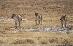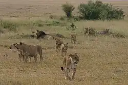 Der Jagderfolg ist abhängig vom Geschick der jagenden Tiere, von der Tageszeit, den lokalen Gegebenheiten und der bejagten Tierart. In der Serengeti sind 14 Prozent aller Jagden auf Riedböcke und 32 Prozent aller Angriffe auf Gnus erfolgreich.[40] Der Jagderfolg von Löwen ist damit dort deutlich geringer als der von Afrikanischen Wildhunden oder Geparden. Da Löwen in offenen Landschaften jagen, erhöht die gemeinsame Jagd die Chance, erfolgreich Beute zu schlagen. Nach einer Untersuchung in der Serengeti verdoppelt sich der Jagderfolg, wenn zwei Löwinnen gemeinsam jagen. Der Jagderfolg stieg in dieser Untersuchung jedoch nicht wesentlich an, wenn mehr als zwei Löwinnen an der Jagd beteiligt waren. Eine Studie in einer halbwüstenähnlichen Region in Namibia kam dagegen zu dem Ergebnis, dass diejenigen Rudel den höchsten Jagderfolg haben, bei denen mehrere Löwinnen ihre Jagdtechnik eng koordinieren. In dieser weitgehend deckungslosen Landschaft kreisten einige Löwinnen die Beute ein, während andere sich in einem Hinterhalt auf die Lauer legten.[40] Ein weiterer Vorteil der gemeinschaftlichen Jagd liegt darin, dass die Beute im Rudel leichter gegen andere Räuber wie Wildhunde und Hyänen verteidigt werden kann.