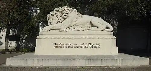 Der Auftrag zur Errichtung eines Denkmales in Erinnerung an die Gefallenen der Schlacht bei Aspern durch Erzherzog Albrecht erteilt, um an die Verdienste seines Vaters zu erinnern.[1] Als Standort wählte man den Platz vor der Asperner St. Martins-Kirche, da dieses Gebäude und der davor liegende Platz im Zentrum der Schlacht lag. Geschaffen wurde die Skulptur von dem Bildhauer und Bildgießer Anton Dominik Fernkorn, der sich bereits zu Lebzeiten großer Bekannt- und Berühmtheit erfreute und ein zentraler Meister des Historismus war. Er beschäftigte sich mit dem Denkmal seit 1855. Nach verschiedenen Entwürfen, in welchen der liegende Löwe lediglich als Nebenfigur erscheint, gelangte Fernkorn schließlich zu der monumentalen Fassung eines mächtig hingestreckten, sterbenden Tieres, wobei der Löwe als kriegerisches Symbol sich besonders seit dem Ausgang des 18. Jahrhunderts großer Beliebtheit erfreute und in der klassizistischen Grabmalsplastik oftmals verwendet wurde. Fernkorn machte für sein Modell im Schönbrunner Tiergarten zahlreiche Studien nach der Natur.[2]