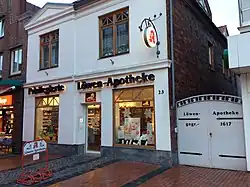 Zunächst befand sich die Löwen-Apotheke von 1617 bis 1932 in der Langebrückstraße 8. Aufgrund der Enge der Straße zog man dann in die Kieler Straße 23, wo die Apotheke bis heute ihren Sitz hat. Das im Jahr 2017 gefeierte Jubiläum zum 400-jährigen Bestehen der Apotheke wurde auch in den Stadtführungen thematisiert.[6]