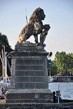 Der Bau der Quaianlagen mit Promenaden, Wiesen und Parks entlang des Zürichsees war 1887 abgeschlossen. Im April 1894 wandte sich ein Zürcher Initiativkomitee mit einem Spendenaufruf an die kunstliebende Öffentlichkeit, um ein noch nicht namentlich genanntes Quai mit einem «monumentalen Löwen als Wappenhalter Zürichs» schmücken zu können. Urs Eggenschwyler hatte hierfür (noch ohne Entlöhnung) bereits ein 40 Zentimeter grosses Modell geschaffen, das in unbestimmter Zukunft in Bronze ausgeführt werden sollte. Die Steinfabrik Zürich hatte sich «in verdankenswerter Weise bereit erklärt, einen Abguss in Kunststein unentgeltlich zu erstellen».[2]