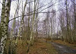 Die Buddestraße führt an die Provinzstraße, diese wird überquert und dem Supermarkt links herum zur Frühlingstraße ausgewichen. Dieses folgende Gebiet neben der Kolonie Schönholz (Waldsteg-Siedlung) gehörte bis 1938 zu Reinickendorf und wurde dann Pankow zugeordnet. Die damals getroffene Grenzlinie liegt immer östlich der Bahnstrecke und greift mitunter um einige zehn Meter weiter. Der Bereich der Berliner Mauer mit ihren zusätzlichen Anlagen lag auf der Pankower (Ost-Berliner) Seite in einem Streifen von etwa 60 Metern. Durch dieses Gebiet heute mit der Absicht als „Birkenwäldchen auf dem ehemaligen Todesstreifen“ umgesetzt führt so durch grüne teils wilde Waldflächen meist mit Birken. Die zwischen 1961 und 1990 unterbrochenen Straßen führen nun wieder durch und werden wie die Klemkestraße überquert. Wobei die Wegelinie vorwiegend der Bezirksgrenze folgt. Nach der Klemkestraße und neben der KGA ‚Straße vor Schönholz‘ geht es dabei durch ein seit 1990 gewachsenes Wäldchen aus Birken, wo sich die Eigenheimgrundstücke des Bahnsteigs befanden, von denen heute noch die jenseits liegende verbleibende Lage der Siedlung „Kolonie Schönholz“ bis zum Waldsteg zeugt. Innerhalb dieses Wäldchens in Höhe der Verlängerung Straße 78 liegt die Ortsteilgrenze und Niederschönhausen wird verlassen.