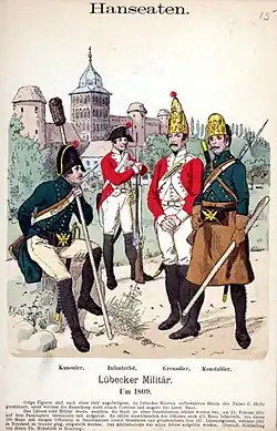 Das eigentliche Lübecker Stadtmilitär war eine reine Infanterietruppe, die sich bis 1750 aus Musketieren zusammensetzte; vorübergehend hatte es von 1713 bis 1718 eine Kompanie Grenadiere gegeben. Erst 1751 wurde erneut eine Grenadierkompanie aufgestellt, die Grenadiermützen mit Vorderschild aus Messingblech erhielt.