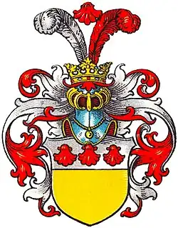 Blasonierung: Von Silber und Gold geteilt, oben drei rote Pilgermuscheln. Auf dem gekrönten Helm mit rot-silbernen Helmdecken zwei Straußenfedern, die rechte silbern, die linke rot, dazwischen eine rote Muschel.[1]