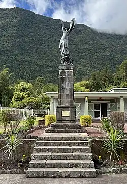 Wegen der teilweisen Nacktheit der nahe der Kirche stehenden Frauenfigur wandte sich 1941 der Pfarrer, Pater Gabriel Bourasseau, gegen das Denkmal und forderte die Entfernung. Er war schockiert, dass der Toten durch eine Frau mit nackten Brüsten gedacht wurde. Mit Hilfe einiger Mitglieder der Kirchengemeinde ließ der Pater das Denkmal sprengen. Bei dem dadurch entstehenden Sturz der Statue brachen beide Arme der Figur ab. Die Stücke wurden bis 1946 hinter einem Friseursalon,[1] nach anderen Angaben in einem Schuppen verstaut. In der Amtszeit des letzten Gouverneurs von Réunion, André Capagorry, (1942–1947) wurde die durch Schweißung reparierte Figur jedoch im Garten der Verwaltung in Hell-Bourg aufgestellt. 1948 stürzte sie bei einem Zyklon erneut.