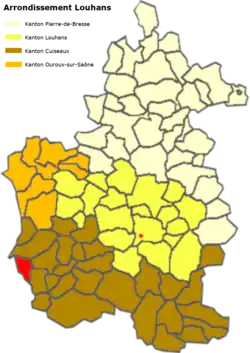 Die Gemeinde liegt in der Landschaft Bresse im äußersten Südwesten des Arrondissement Louhans, sie grenzt im Westen an das Arrondissement Mâcon und das Gemeindegebiet westlich des Bourg wird bereits der Landschaft Vallée de la Saône[2] zugerechnet. Durch das nördliche Gemeindegebiet fließt der Bief du Moulin Richy[3] quer durch die Gemeinde, um kurze Zeit später in die Saône zu münden. Der nächste Punkt der Gemeinde liegt lediglich 600 Meter von der Saône entfernt, dazwischen liegt der südliche Ausläufer der Gemeinde Simandre.