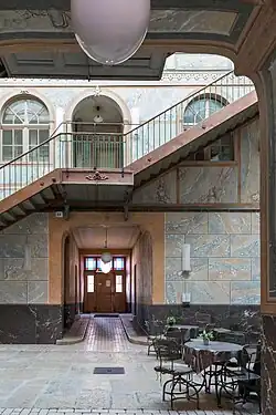 Die Ausrichtung der Wohnungen auf einen geteilten Innenhof sollte diesem Konzept folgend die Arbeiterfamilien moralisch stärken, indem unter anderem mögliches Missverhalten (beispielsweise Alkoholismus oder spätes Nachhausekommen) den anderen Familien bekannt wurde und so eine Art soziale Selbstregulation stattfinden würde. Ob die Bauherren beim Umbau diesem Konzept folgten, ist nicht eindeutig belegt. Deutlich wird jedoch, dass bei der ästhetischen Ausgestaltung des Innenhofs nicht gespart wurde, insbesondere als dieser 1902 erneut umgebaut wurde. Der Trompe-l’œil-Marmor und die feingearbeiteten Einbauten geben dem glasüberdachten Innenhof mit gepflastertem Boden eine besondere Schönheit und machen das von aussen nüchtern wirkende Haus zur Sehenswürdigkeit.[1]