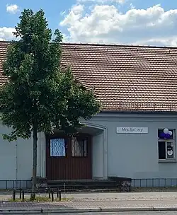 Im Ostgiebel sind drei Fenster eingebaut und mittig entstand mittels einer flachen außen angebauten Doppelrampe ein barrierefreier Eingang. Von diesem gehen im Inneren des Gebäudes beiderseits die oben genannten Nutzerbereiche ab.