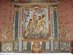 Die Kirche besitzt ein reich ausgeschmücktes und aus Holz geschnitztes Retabel. Auf zwei Ebenen wird es strukturiert von Schlangensäulen, an den Seiten umgeben von Voluten, ausgestaltet mit Flachreliefs aus zahlreichen Pflanzenmotiven, illustrierten Szenen und Heiligenfiguren. In der Mitte zieht ein Kruzifix den Blick des Betrachters auf sich. Darunter befindet sich der Tabernakel, der in das Retabel integriert ist. Der Schrein ist wie bei der Kirche in Arhan mit der Darstellung von Christus in der Rast verziert.[26]