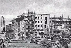 In der Zeit von 1951 bis 1953 entstand in diesem schwer von Zerstörungen des Zweiten Weltkriegs betroffenen Bereich dieser Neubaukomplex. Der vorher in diesem Gebiet bestehende Engpass des Breiten Wegs wurde dabei zugunsten einer deutlich breiteren Fassung des Straßenraums aufgegeben. Die historisch in dem Areal auf den Breiten Weg einmündende Steinstraße wurde aufgegeben und überbaut. Die Schildergasse wurde deutlich überformt und blieb nur als aktuell unbenannte Wegebeziehung erhalten. Auch die Reste einer Vielzahl historischer Gebäude wurden abgerissen, darunter die Häuser Zur Jagd, Zum Turm, Zum weißen Roß, Zum Türmchen, Zum blauen Stern, Zum goldenen Hirsch, Franziskaner, Zu den drei Rosen, Zu den drei goldenen Schlüsseln und Zum Himmelreich.