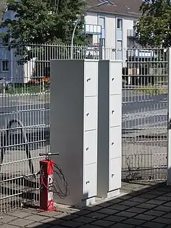 Mit dieser Bauart wird Ladeinfrastruktur für eine Fahrradabstellanlage ohne Zuordnung zu bestimmten Stellplätzen kompakt an einer Stelle angeboten. Anlagen dieser Bauart bestehen üblicherweise aus einer matrixförmigen Anordnung mehrerer so genannter Ladeschließfächer, in die die Nutzer diebstahlgeschützt ihr persönliches Ladegerät und ihren Akku zum Laden einschließen können. Die Fächer bestehen in der Regel aus feuerhemmendem Stahlblech und enthalten je nach Modell eine oder zwei konventionelle 230-V-Steckdosen pro Fach.