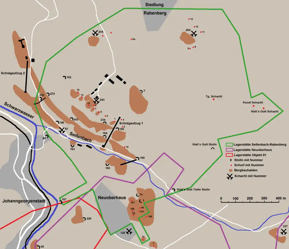 Die Lagerstätte Seifenbach-Rabenberg ist die nördliche Fortsetzung der Lagerstätte Neuoberhaus. Im NW ist sie durch den Eibenstocker Granit und im NO durch die Störung Rabenberg begrenzt.