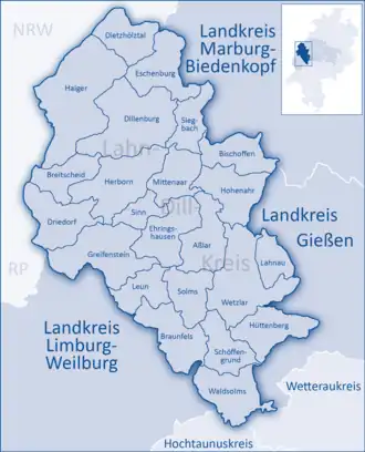 - einem Teil des aufgelösten Landkreises Wetzlar mit den Städten Braunfels und Leun sowie den Gemeinden Aßlar, Biebertal, Bischoffen (ehemals Landkreis Biedenkopf), Ehringshausen, Hohenahr, Hüttenberg, Schöffengrund, Solms und Waldsolms.[4][5]