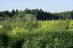 Laipersdorf ist bekannt für den Hopfen- und Obstanbau. Rechts sieht man ein Hopfenfeld kurz vor der Ernte, die Anfang Oktober beginnt. In den umliegenden Teichen werden traditionell Karpfen gezüchtet.