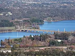 Der Lake Burley Griffin kann an drei Stellen überquert werden: auf der Commonwealth Avenue Bridge (310 m), auf der Kings Avenue Bridge (270 m) und auf der Straße über den Scrivener-Damm. Beide Brücken waren vor dem Auffüllen des Sees erbaut worden und ersetzten Holzkonstruktionen.[47] Sowohl für die Kings Avenue Bridge als auch für die Commonwealth Avenue Bridge fanden Ende 1959 und Anfang 1960 Standorttests statt. Der Bau der ersteren begann 1960, der Bau der letzteren im darauf folgenden Jahr. Die Bauherren profitierten davon, dass Canberra damals eine Dürreperiode erlebte und der Boden deshalb während der Bauarbeiten trocken blieb.[40] Beide Brücken bestehen aus Spannbeton,[51] verstärkt mit rostfreien Stahlseilen.[52]