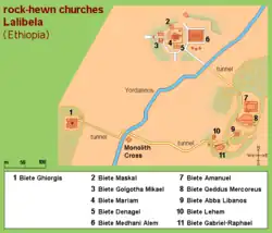 Lalibela ist weltweit bekannt für die elf monolithischen Kirchen, die in rostroten Tuff gemeißelt sind. Die Kirchen entstanden beginnend mit der Regentschaft von Kaiser Gebra Maskal Lalibela, auch bekannt unter dem Namen Heiliger Lalibela (ein Mitglied der Zagwe-Dynastie) im 12./13. Jahrhundert. Wahrscheinlich wurde insgesamt 100 Jahre an der Anlage gebaut.[1] In dieser Zeit blühte der christliche Glaube in Äthiopien, die Kirchen werden auch als Symbol für die enge Verbundenheit der äthiopischen Christen mit dem Heiligen Land verstanden. Seit 1978 zählen diese Kirchen zum Weltkulturerbe der UNESCO. Lalibela hat eine lange christliche Tradition der äthiopisch-orthodoxen Kirche und ist ein Pilgerort für viele Christen.