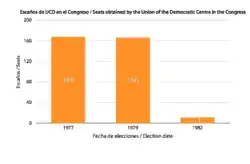 In der Folgezeit zerfiel die Unión de Centro Democrático des bislang regierenden Ministerpräsidenten Adolfo Suárez.[7] Ein Teil des sozialdemokratischen Flügels um Francisco Fernández Ordóñez bildete im November 1981 die Demokratische Aktionspartei PAD (Partido de Acción Democrática), die sich später der sozialistischen PSOE anschloss.[8] Nachdem er bei der Wahl des Parteivorsitzenden unterlegen war, verließ der prominenteste Vertreter der Partei, Adolfo Suárez, die UCD im Juli 1982 und gründete mit seinen Anhängern das Demokratische und soziale Zentrum CDS (Centro Democrático y Social). Zudem verließ eine Gruppe von Christdemokraten um Óscar Alzaga die UCD und bildete die Demokratische Volkspartei PDP (Partido Demócrata Popular).[9] Diese schloss sich zur Parlamentswahl im Oktober 1982 mit der post-franquistischen Volksallianz AP (Alianza Popular) unter Manuel Fraga zu einem Mitte-rechts-Bündnis zusammen.[10] Sowohl für die Rumpf-UCD unter ihrem Präsidenten und Fraktionsvorsitzenden Landelino Lavilla als auch für Suárez’ CDS war die Wahl ein Debakel. Die UCD erhielt noch 6,8 Prozent der Stimmen und elf Sitze von 350 Sitze der Abgeordnetenkammer, das CDS schnitt mit zwei Sitzen noch schwächer ab. Die meisten früheren UCD-Wähler wechselten zum rechten Bündnis AP-PDP, aus dem 1983 die Volkskoalition (Coalición Popular) und später die konservative Volkspartei PP (Partido Popular) hervorging. Im Februar 1983 löste sich die UCD auf.